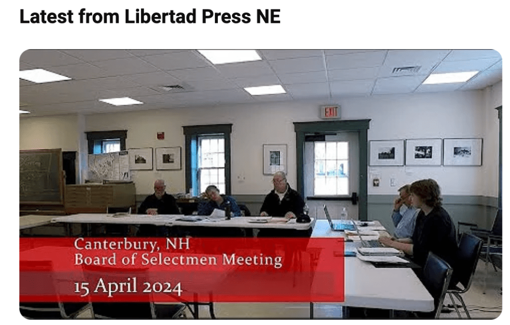 It is gratifying to see that the videos of Selectboard meetings posted by Edgar Rivera, on YouTube Libertad Press NE, have been getting 200+ views! Equally satisfying to be stopped at the Elkins Library, the Canterbury Store, or the Transfer Station by neighbors who have questions about something they saw, or wanted a little clarification about something they couldn’t quite hear. Thanks for becoming part of the conversation!