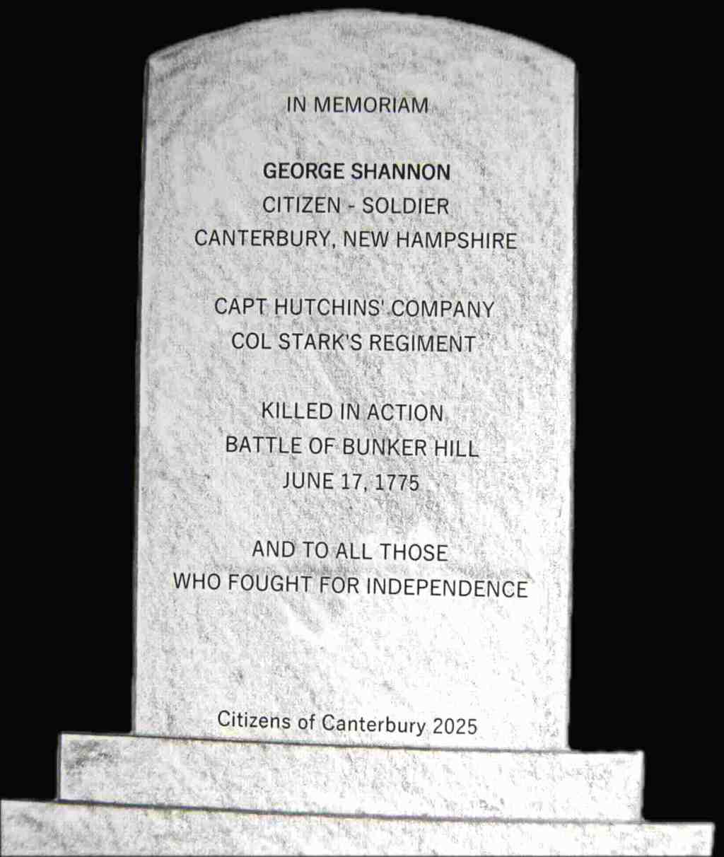 This fall the citizens of Canterbury will place a memorial stone in the northeast corner of the Center Cemetery honoring George Shannon and those who fought for our country’s independence. It will be dedicated on Memorial Day 2025. The stone will be gray granite, 42″ high with an arched top, 18″ wide, 4″ deep.