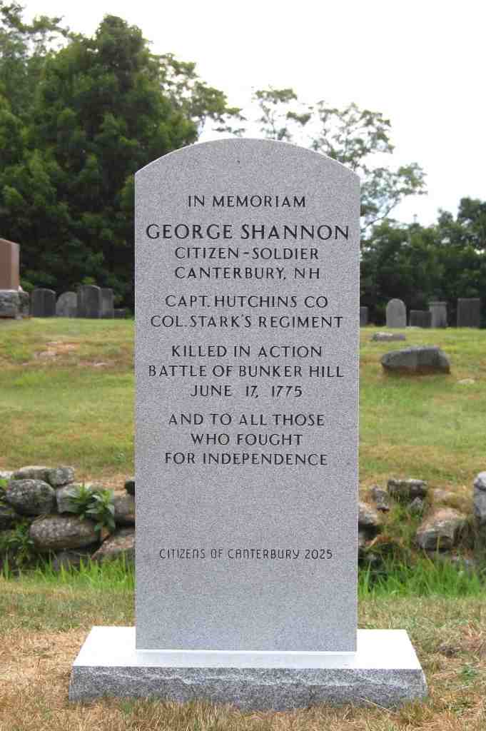 In the 249th year of our great country, the town of Canterbury is honoring one of its past citizens: George Shannon, Revolutionary War soldier, who was killed at the Battle of Bunker Hill on June 17, 1775. In honoring George Shannon, we also honor the many Canterbury citizens who fought for our country’s independence. It is therefore appropriate that a memorial stone has been erected in the northeast corner of the Center Cemetery in commemoration of these patriots.