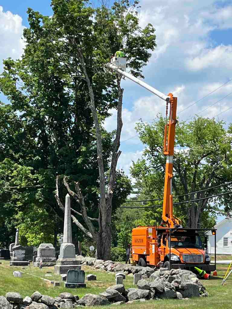 An ailing maple tree in the Center came down yesterday due to concerns that it was rotting and posing a threat to power lines if it fell toward the road and the Center Cemetery if it fell to the south. The work was done by Asplundh, the tree removal company, which raised concerns on behalf of Unitil.