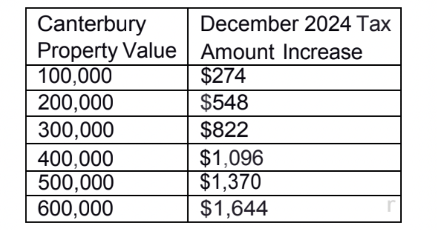 Here is the formula for tax calculation: Canterbury Apportionment of School Budget / Canterbury Assessed Value x 1,000 = tax rate per $1,000 of assessed value.