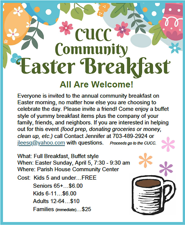 Everyone is invited to the annual community breakfast on Easter morning, no matter how else you are choosing to celebrate the day. Please invite a friend! Come enjoy a buffet style of yummy breakfast items plus the company of your family, friends, and neighbors. If you are interested in helping out for this event (food prep, donating groceries or money, clean up, etc.) call Contact Jennifer at 703-489-2924 or jleesq@yahoo.com with questions. Proceeds go to the CUCC.